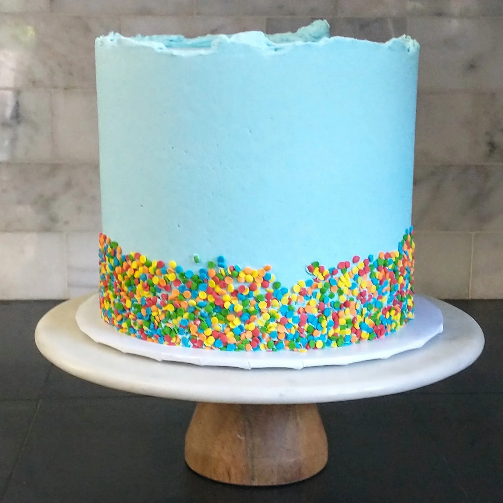Drip with Sprinkle or Crumb Skirt: Chose frosting color, drip color, and sprinkle color. May also be done on chocolate cakes.