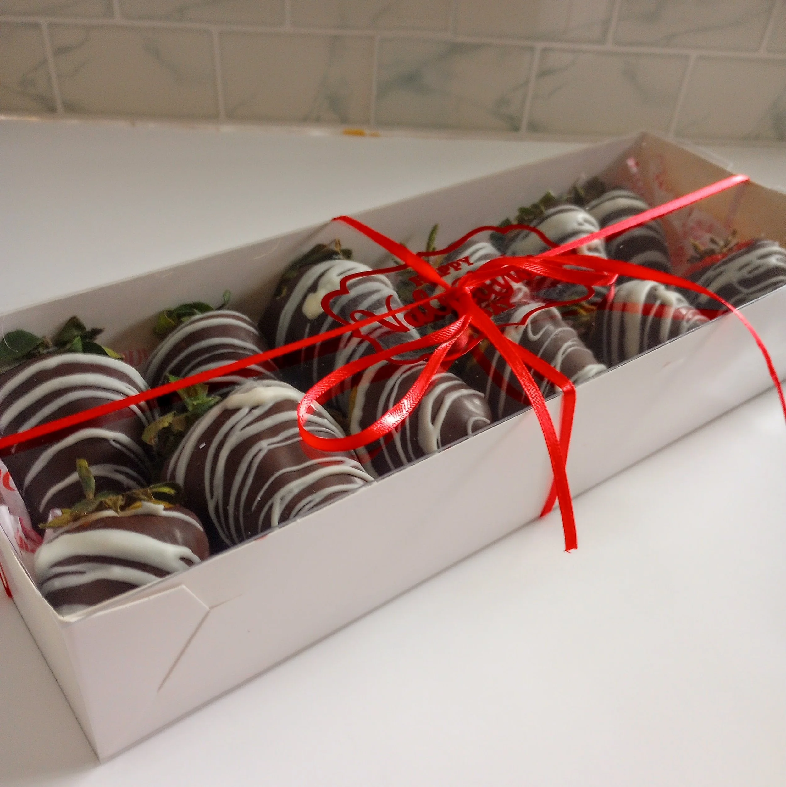 l2 large, juicy strawberries dipped in Belgian semi-sweet chocolate, and drizzled with real white chocolate.